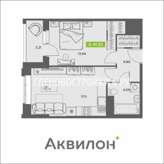 1-комн.Площадь: 41.55м2