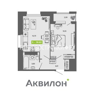 1-комн.Площадь: 38.6м2