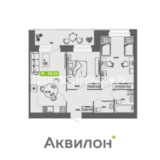 2-комн.Площадь: 58.3м2