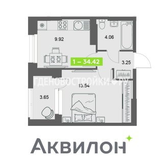 1-комн.Площадь: 34.42м2