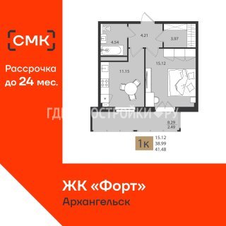1-комн.Площадь: 41.48м2