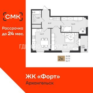 Продажа квартиры: 2-комн., 56.71 кв.м, 8.57 млн.руб. (id:174996)