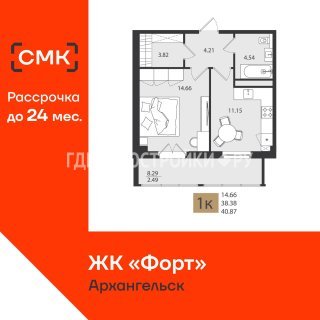 Продажа квартиры: 1-комн., 40.87 кв.м, 5.92 млн.руб. (id:175017)