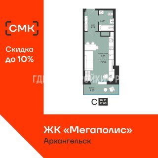 Продажа квартиры: Студия, 27.6 кв.м, 4.96 млн.руб. (id:173965)