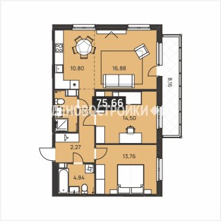 3-комн.Площадь: 75.66м2