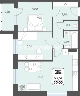 Евро-3-комн.Площадь: 55.05м2