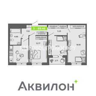 3-комн.Площадь: 69.46м2
