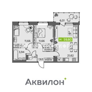 2-комн.Площадь: 59.8м2