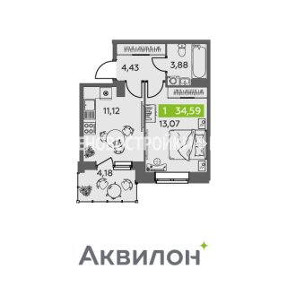Продажа квартиры: 1-комн., 34.59 кв.м, 4.44 млн.руб. (id:173347)