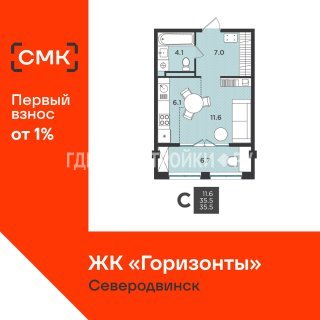 СтудияПлощадь: 35.5м2