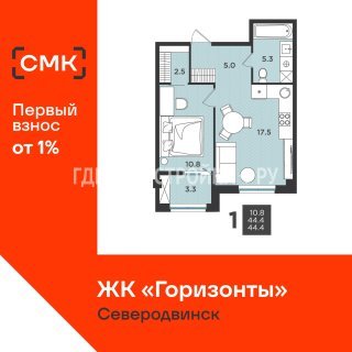 2-комн.Площадь: 44.4м2