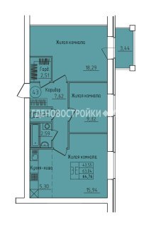 3-комн.Площадь: 64.76м2