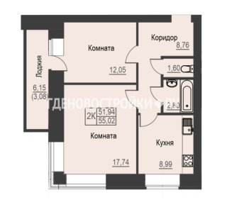 2-комн.Площадь: 55.02м2