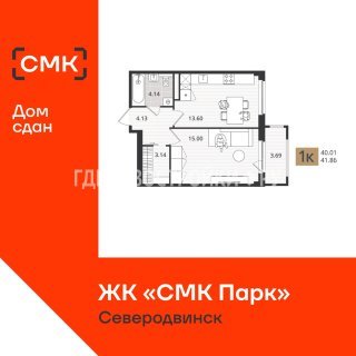 1-комн.Площадь: 39.7м2