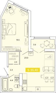 2-комн.Площадь: 55.4м2