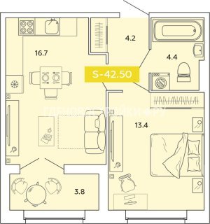 1-комн.Площадь: 42.5м2
