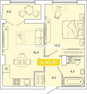 2-комн.Площадь: 43.7м2