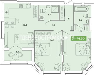 3-комн.Площадь: 74.9м2